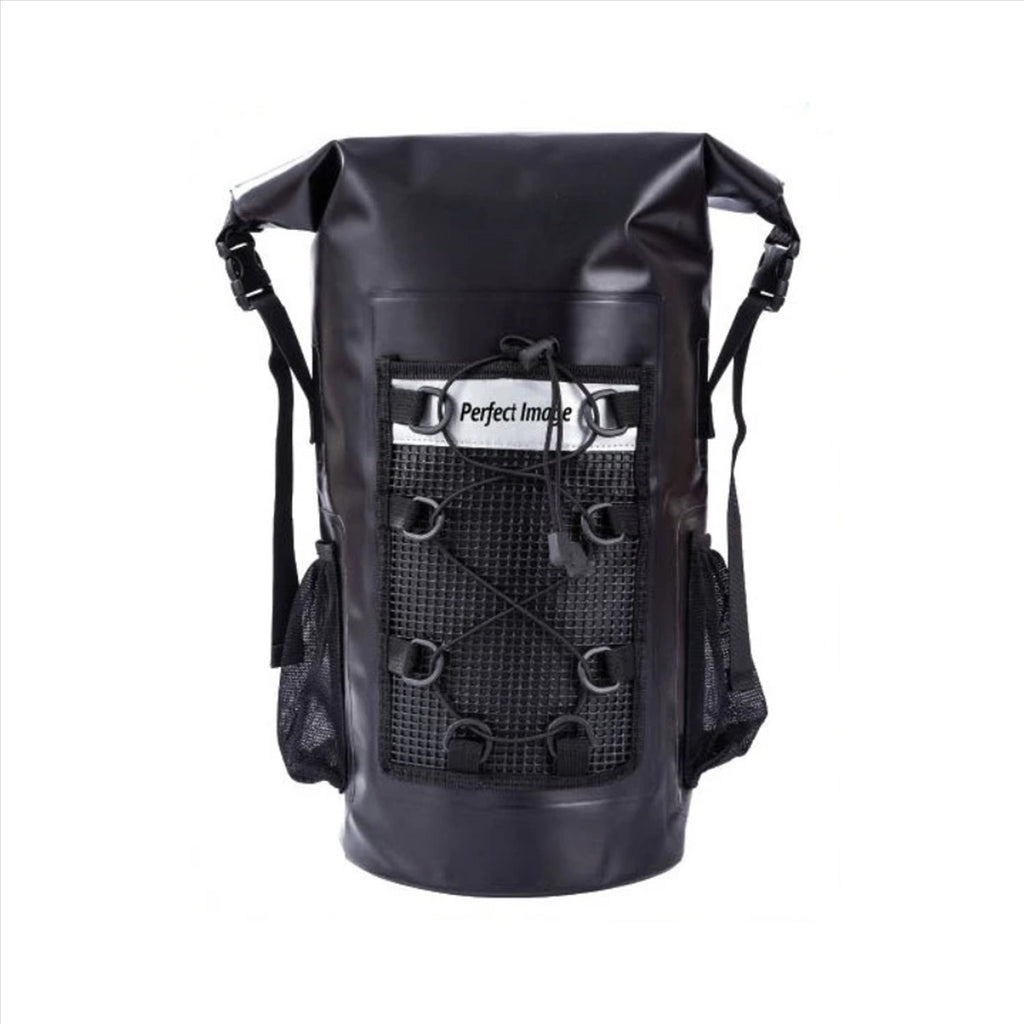 Roll top dry bag with high seal inside backpack External dry pocket Detachable shoulder straps Safety clip lock Two bottle holders on side of backpack