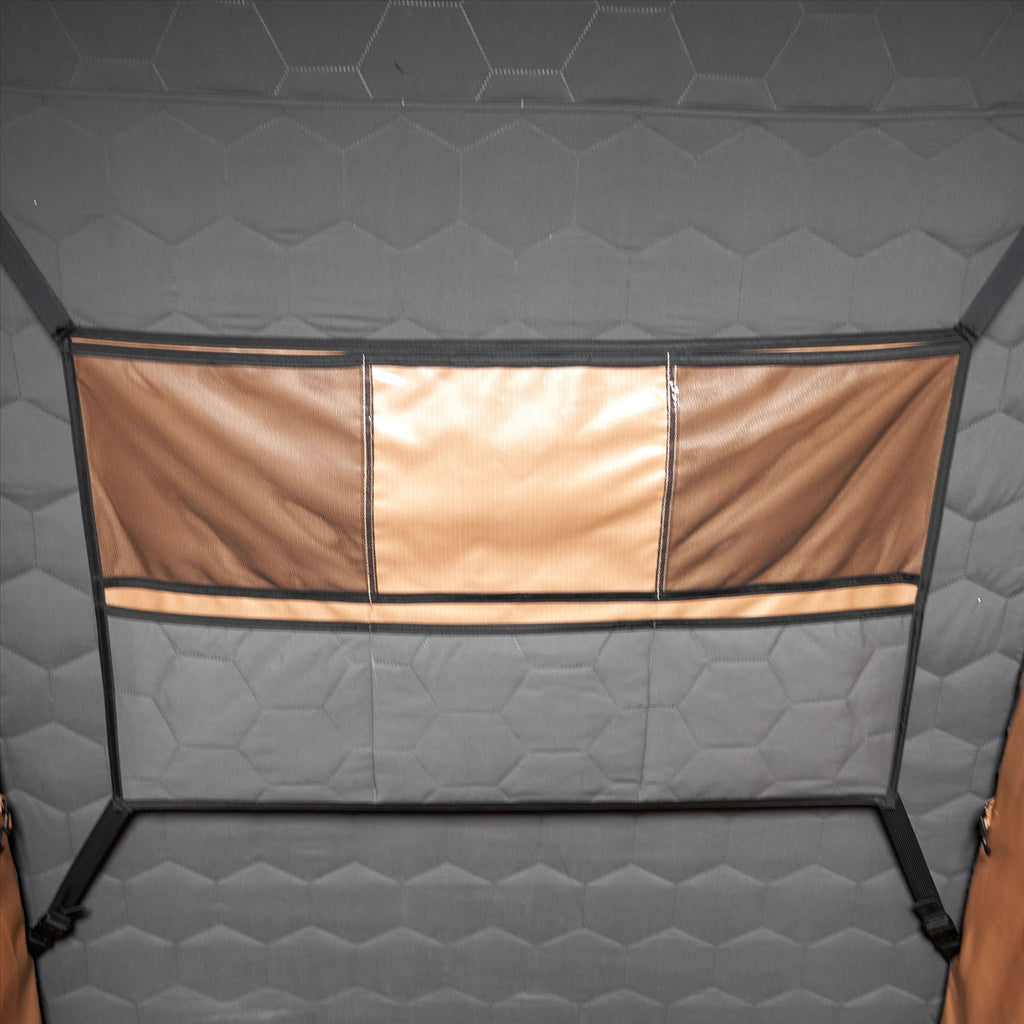 New Storage System: Multiple ceiling pockets, including a PVC phone pocket for convenience, ceilign hooks to hang lighting etc